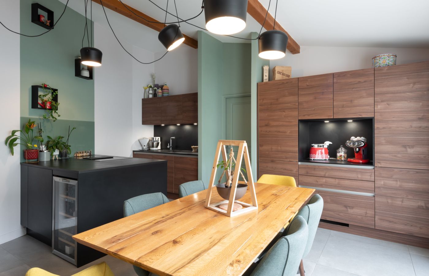 Cet appartement moderne situé à Mornant dévoile une cuisine qui allie à la perfection l’élégance et la fonctionnalité. La cuisine NOLTE, modèle “plus noir”, se mêle audacieusement au noyer royal et devient le cœur de cet espace de vie. Le plan de travail en granit noir “Zimbabwe” ajoute une touche de sophistication inégalée.