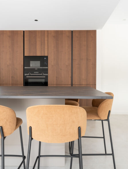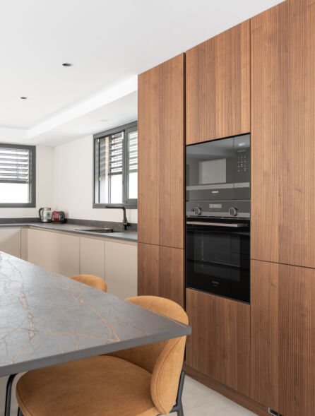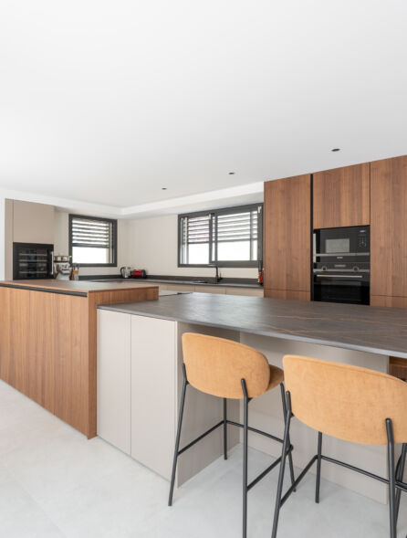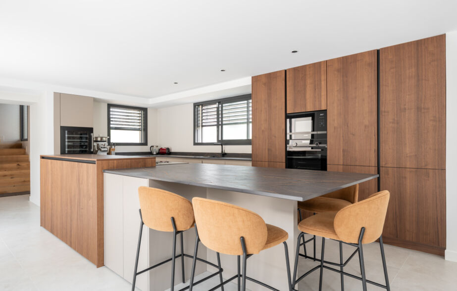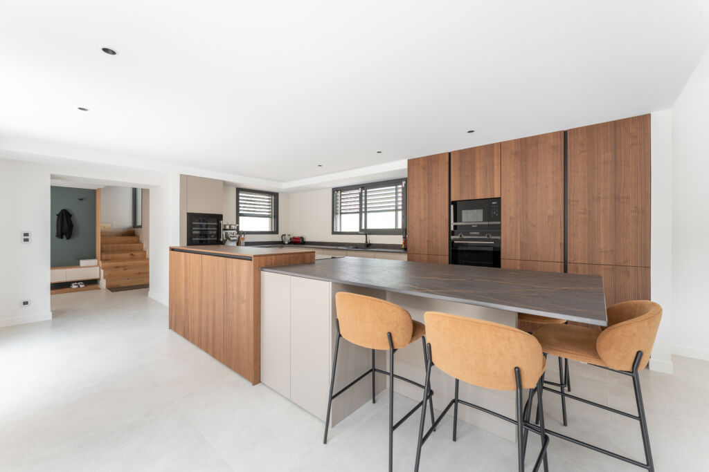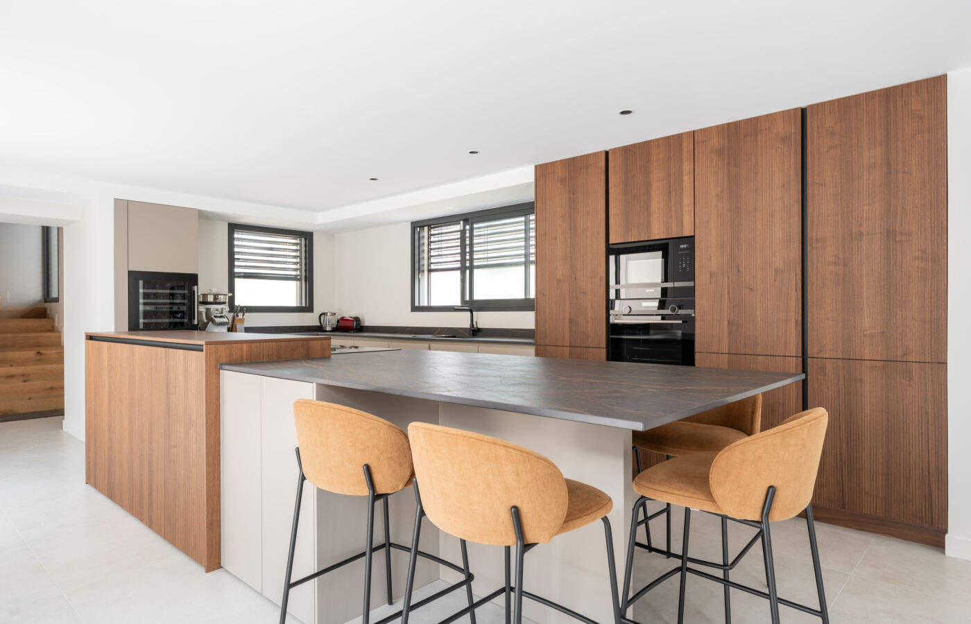 La pièce centrale ? Une cuisine LEICHT, modèle BOSSA en véritable noyer cannelé : un choix audacieux, à la fois graphique et chaleureux, qui structure l’espace avec caractère.