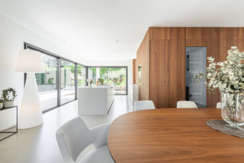 Le bois de noyer s’harmonise élégamment avec les lignes blanches et épurées du mobilier en laque mate. Un projet réalisé d’une main de maître par notre concepteur expert Aurélien NICOD.