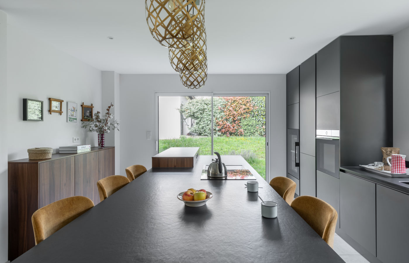 Plongez au cœur de cette demeure haut de gamme nichée dans la commune de Saint-Genis-Laval. Avec un agencement signé LEICHT KÜCHEN, l’alliance subtile du gris carbone et du noyer crée une atmosphère à la fois sophistiquée et chaleureuse.
