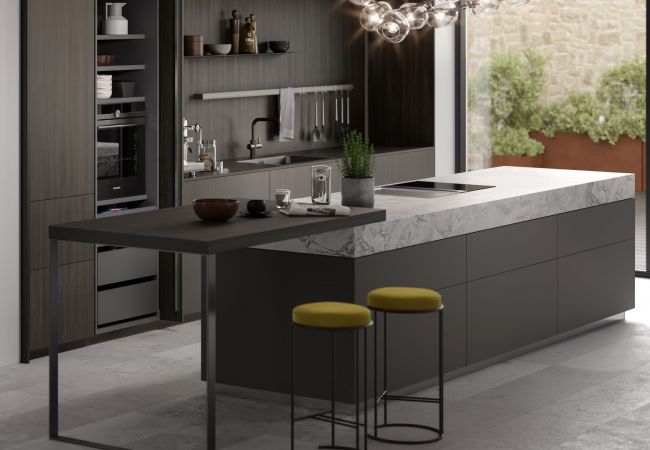 Dans ce cas, nos plans de travail unis sont discrets, élégants et soulignent au maximum les détails fins de la cuisine.