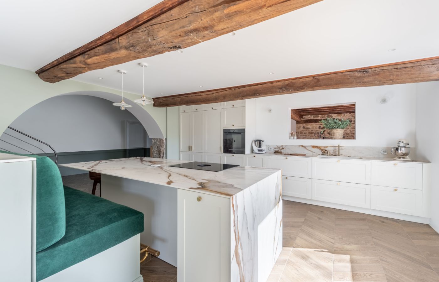 • Cuisine avec îlot central : idéal pour les grands espaces, l’îlot central permet de fluidifier le parcours culinaire tout en offrant des zones de rangement supplémentaires et des places assises pour les repas improvisés.